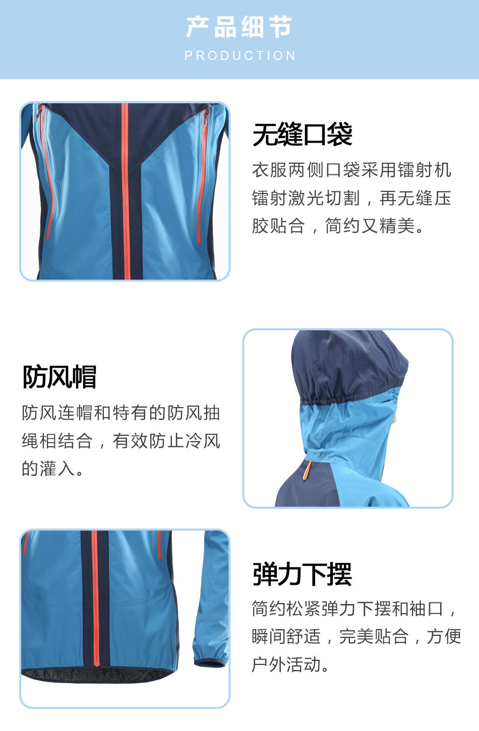 無(wú)縫口袋:衣服兩側(cè)口袋采用鐳射機(jī)鐳射激光切割,再無(wú)縫壓膠貼合,簡(jiǎn)約又精美。