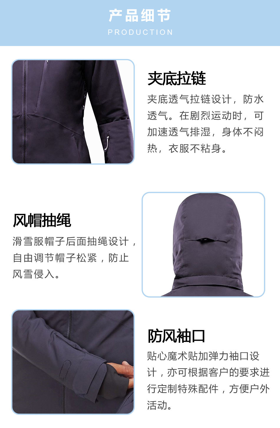 • 風帽抽繩防水滑雪服定制出的帽子后面抽繩設計,自由調節帽子松緊,防止風雪侵入。