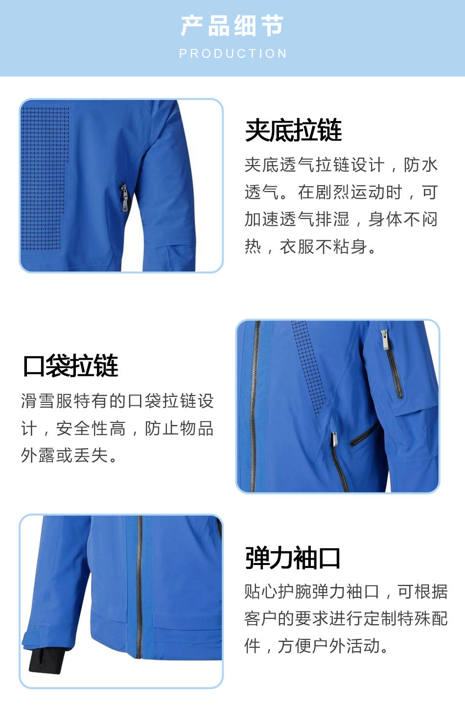 彈力袖口:貼心護腕彈力袖口,可根據客戶的要求進行定制特殊配件,方便戶外活動。